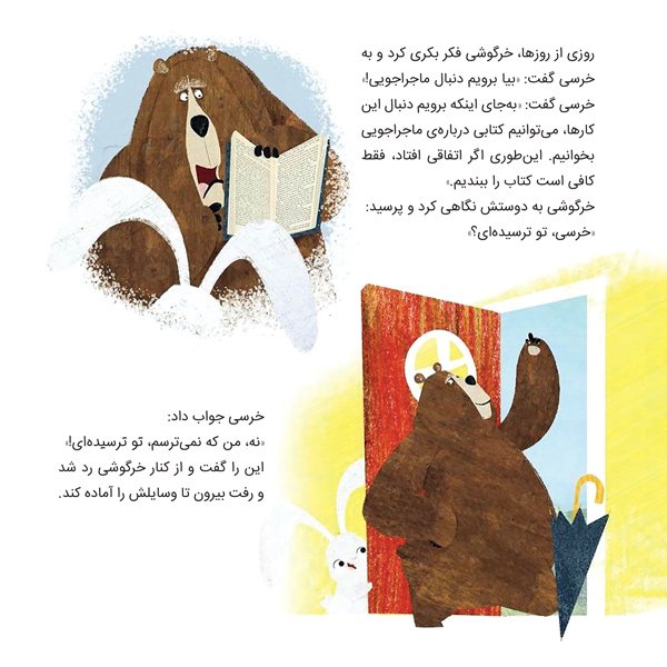 خرسی بیخودی از همه چیز میترسید، اما دوستش خرگوشی اصلا ترسو نبود و همهاش داستانهای ترسناک میخواند. یک روز خرگوشی فکر بکری کرد و از خرسی خواست که...