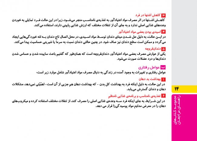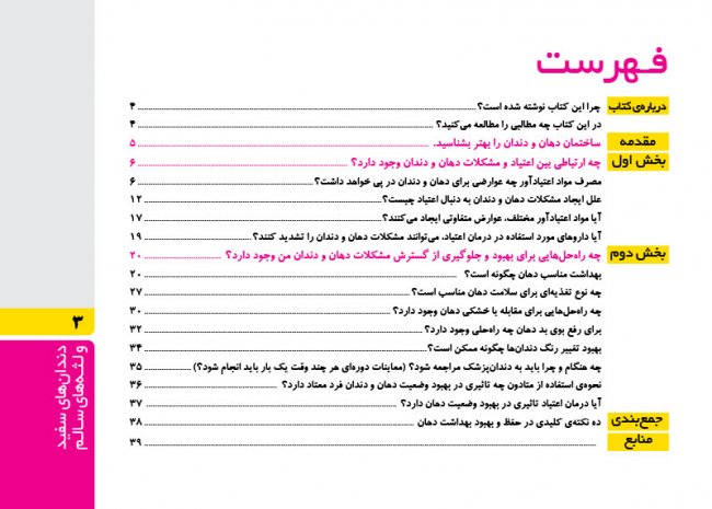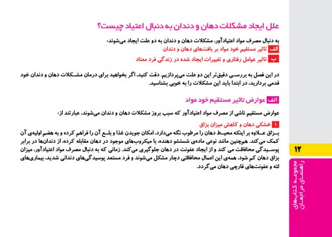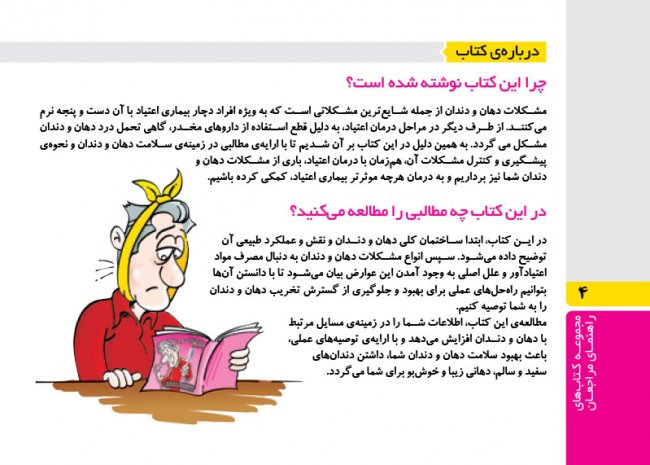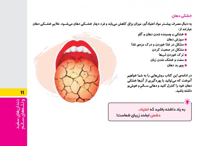مشکلات دهان و دندان از جمله شايعترين مشکلاتي است که به ویژه افراد دچار بيماري اعتياد با آن دست و پنجه نرم ميكنند. از طرف ديگر در مراحل درمان اعتياد، به دليل قطع استفاده از داروهاي مخدر، گاهي تحمل درد دهان و دندان مشکل مي گردد. به همین دلیل در اين كتاب بر آن شديم تا با ارايهی مطالبي در زمينهی سلامت دهان و دندان و نحوهی پيشگيري و کنترل مشکلات آن، همزمان با درمان اعتياد، باري از مشکلات دهان و دندان شما نيز برداریم و به درمان هرچه موثرتر بيماري اعتياد، کمکی کرده باشيم. مطالعهی اين کتاب، اطلاعات شما را در زمينهی مسايل مرتبط با دهان و دندان افزايش میدهد و با ارايهی توصيههاي عملي، باعث بهبود سلامت دهان و دندان شما، داشتن دندانهاي سفيد و سالم، دهاني زيبا و خوشبو براي شما ميگردد.