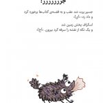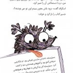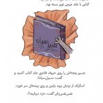 او شاد و شنگول پنجهاش را روی جلد کتاب کشید.