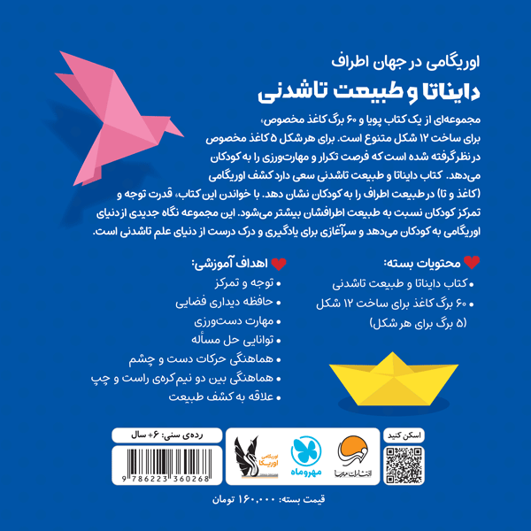 اوریگامی در جهان اطراف و دایناتا طبیعت تاشدنی مجموعه ای از یک کتاب پویا و 60 برگ کاغذ مخصوص ، برای ساخت ۱۲ شکل متنوع است. برای هرشکل 5 کاغذ مخصوص در نظر گرفته شده است که فرصت تکرار و مهارت ورزی را به کودکان میدهد. کتاب دایناتا و طبیعت تاشدنی سعی دارد کشف اوریگامی (کاغذ و تا) در طبیعت اطراف را به کودکان نشان دهد. با خواندن این کتاب ، قدرت توجه و تمرکز کودکان نسبت به طبیعت اطرافشان بیشتر میشود. این مجموعه نگاه جدیدی از دنیای اوریگامی به کودکان میدهد و سرآغازی برای یادگیری و درک درست از دنیای علم تاشدنی است.