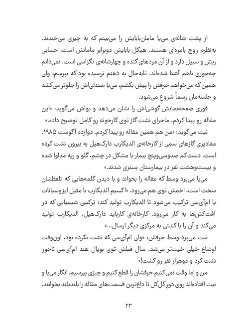 هر سال در سالگرد فاجعهی نشت گازهای سمیِ کارخانهی کارباید سروکلهی دختری با ماسک سمی پیدا میشود که اگر دستش به کسی بخورد کارش ساخته است!