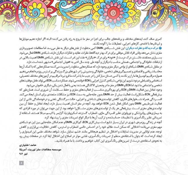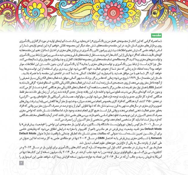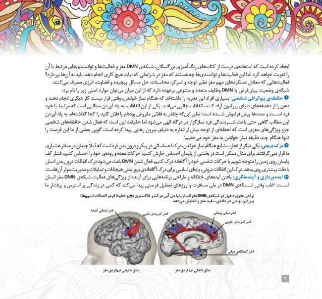 راز فروش فوقالعادهی این کتابها، تاثیرگذاری منحصر به فرد آنها روی مغز و نیاز بشر امروز به این تاثیر خارقالعاده است. شواهد علمی پیشنهاد میکنند که استفادهی درست از کتابهای رنگآمیزی بزرگسالان، شبکهی DMNمغز و توانمندیهای مرتبط با آن را فعال میکند. وقتی ما با استفادهی مناسب از رنگآمیزی، چنین مهارتی را برای فعال کردن DMN به دست میآوریم، علاوهبر کاهش استرس و فشار، به مزایای دیگری هم دست مییابیم. برای دانستن این مزایا، به مقدمهی کتاب سری بزنید.