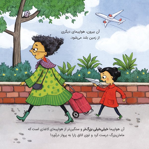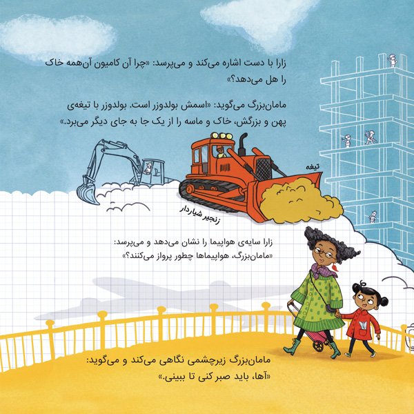 وقتی زارا همراه مامانبزرگش توی شهر گردش میکند، چیزهای جالب و جذابی میبیند و یکعالمه سؤال از او میپرسد؛ مثل اینکه چطوری واگنهای ترن هوایی، برعکس روی ریل حرکت میکنند؟ یا اینکه هواپیما چهجوری توی آسمان میماند؟