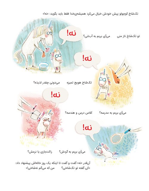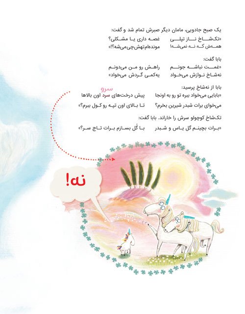 تک شاخ کوچولو همیشه میگفت: «نه! » برای همین نه شاخ صدایش میکردند. او دلش نمیخواست مثل تک شاخهای دیگر باشد. تا اینکه یک روز تصمیم گرفت به جایی...