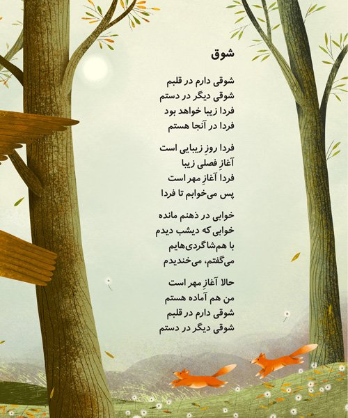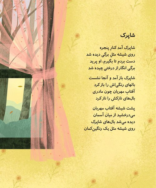 در این کتاب ما را مهمان این شعرهای زیبا کرده است:* شوق * شاپرک * درخت * آشیانه * خدا * آقای باران * پروانه در باران ** کنار بخاری * فصل کبوتر * فصل رنگینکمانها *