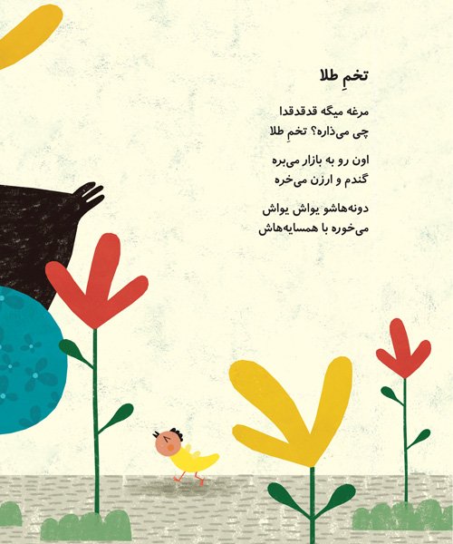 در این کتاب ما را مهمان این شعرهای زیبا کرده است:* تخمِ طلا * عروسی * قورقوری * سوغاتی * ستاره * قیریچ قیریچ ** پیرهنِ پَر * حلزون * گُرُم گُرُم * خواب توی تاب *