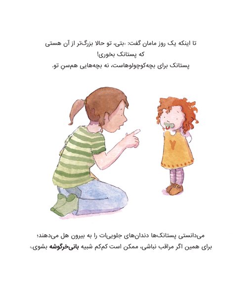 بتی خیلی پستانک دوست داشت و همیشهی خدا یک پستانک توی دهانش بود. تا اینکه یک روز مامان گفت: «بتی، تو حالا دیگر بزرگتر از آن هستی که پستانک بخوری! »...