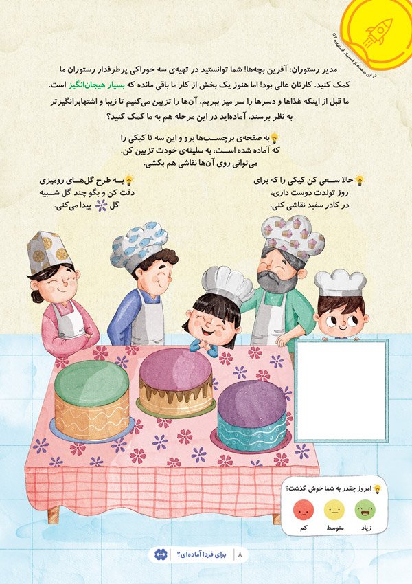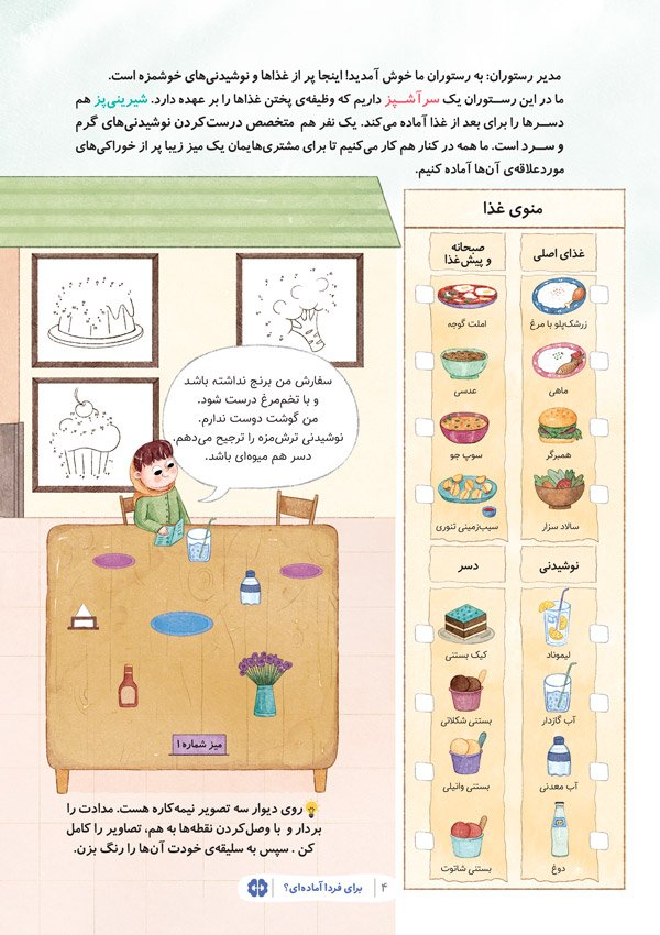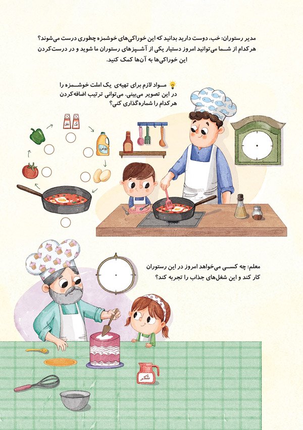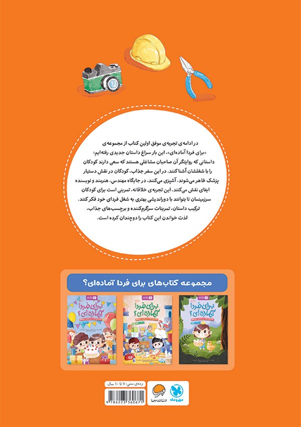 در ادامهی تجربهی موفق اولین کتاب از مجموعهی «برای فردا آمادهای»، این بار سراغ داستان جدیدی رفتهایم؛ داستانی که روایتگر آن صاحبان مشاغلی هستند که سعی دارند کودکان را با شغلشان آشنا کنند. در این سفر جذاب، کودکان در نقش دستیار پزشک ظاهر میشوند، آشپزی میکنند، در جایگاه مهندس، هنرمند و نویسنده ایفای نقش میکنند. این تجربهی خلاقانه، تمرینی است برای کودکان سرزمینمان تا بتوانند با دوراندیشی بهتری به شغل فردای خود فکر کنند. ترکیب داستان، تمرینات سرگرمکننده و برچسبهای جذاب، لذت خواندن این کتاب را دوچندان کرده است.