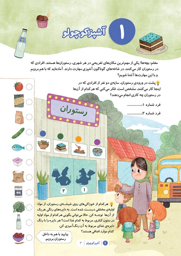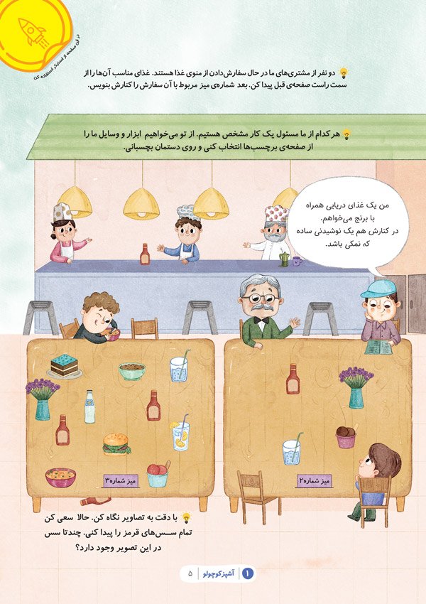 در انتهای این کتاب برچسب هایی قرار گرفته است که کودکان با کمک والدین آنها را جدا کرده و در صفحاتی که نشانه گذاری شده است قرار می دهند.