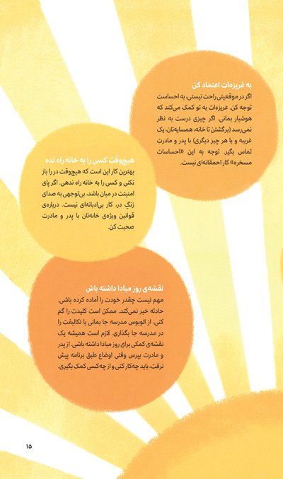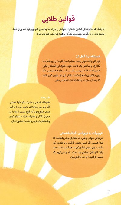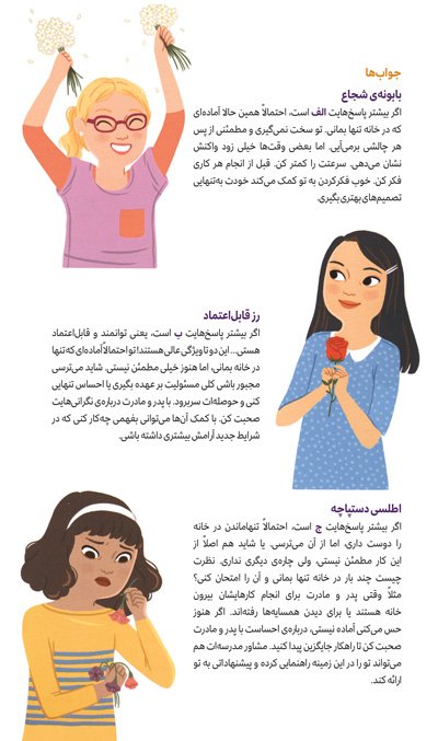 این کتاب راهنمایی است که به تو یاد می دهد وقتی در خانه تنها هستی، چطوری خودت را کنترل کنی و احساس اعتماد به نفس داشته باشی. وقتی در خانه تنها هستی، چه برای نیم ساعت یا یک روز کامل، باید خودت را برای این موارد آماده کنی: