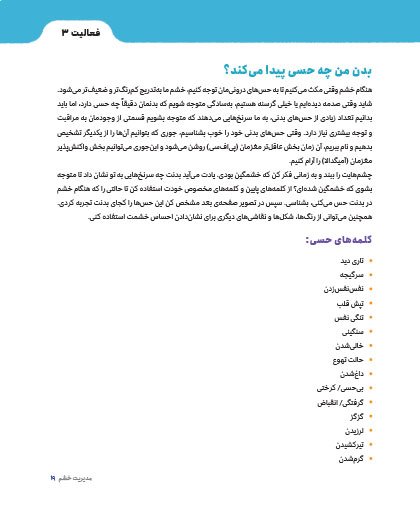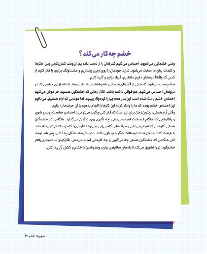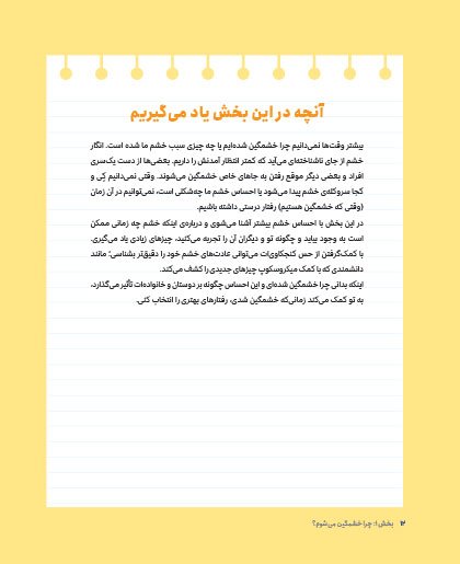 اگر کودک شما بیشتر وقت ها خشمگین است کتاب مدیریت خشم با 40 فعالیت جذاب به کودک شما کمک می کند خشم را مانند سایر احساسات یک احساس طبیعی بداند و سپس با عادت ها و راه اندازه های خشم خود آشنا می شود این طوری می تواند خشمش را در خانه مدرسه و جامعه مدیریت کند و به خشم نشان دهد چه کسی رِئیس است