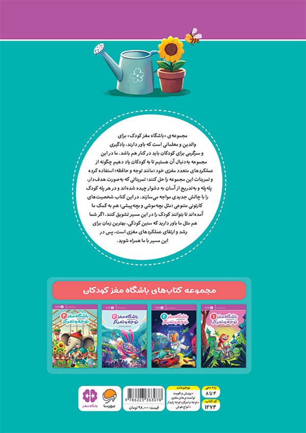 مجموعه ی «باشگاه مغز کودک » برای والدین و معلمانی است که باور دارند، یادگیری و سرگرمی برای کودکان باید در کنار هم باشد. ما در این مجموعه به دنبال آن هستیم تا به کودکان یاد دهیم چگونه از عملکردهای متعدد مغزی خود )مانند توجه و حافظه( استفاده کرده و تمرینات این مجموعه را حل کنند؛ تمریناتی که به صورت هدف دار، پله پله و به تدریج از آسان به دشوار چیده شده اند و در هر پله کودک را با چالش جدیدی مواجه می سازند. در این کتاب شخصیت های کارتونی متنوعی )مثل بچه موشی و بچه پیشی( هم به کمک ما آمده اند تا بتوانند کودک را در این مسیر تشویق کنند. اگر شما هم مثل ما باور دارید که سنین کودکی، بهترین زمان برای رشد و ارتقای عملکردهای مغزی است، پس در این مسیر با ما همراه شوید.