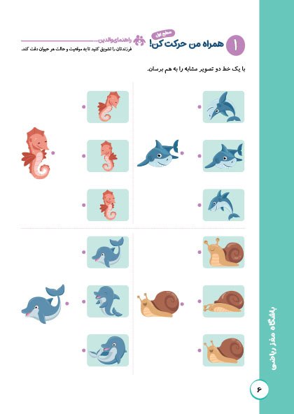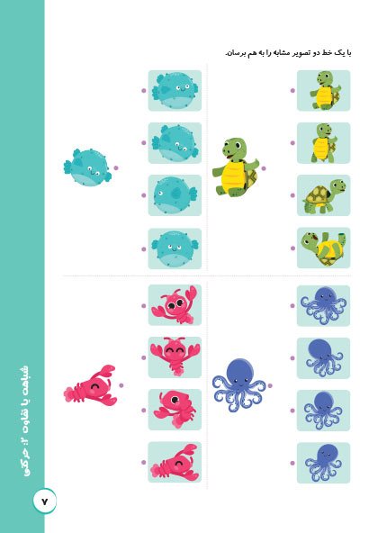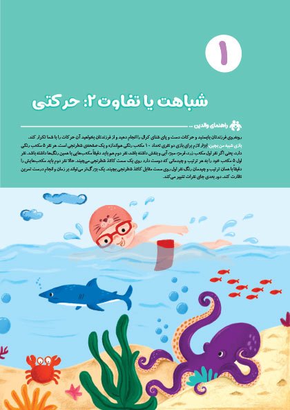 در این کتاب، مهارتهای تشخیص شباهت تفاوتهای حرکتی، جهت در آینه و تقارن نسبت به خط عمودی و پیدا کردن بخشهای ابتدایی و انتهایی مناسب هر جاندار و وسیله به کودکان آموزش داده می شود.