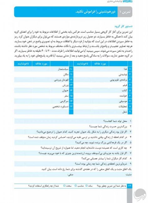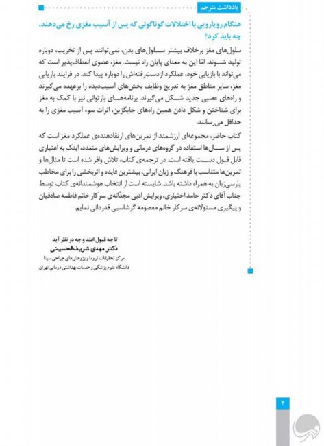 از طرفی، هر کدام از تمرینهای کتاب مانند دستور آشپزی برای تمام افراد قابل اجراست؛ بنابراین زمانی که فرد دچار آسیب ی یا خانوادهی او دنبال روشهایی برای بهبود وضعیت حافظه و مهارتهای تفکر هستند، تهیهی این کتاب، خالی از فایده نخواهد بود. استفاده از این کتاب حتی برای کسانی که میخواهند سالم خود و شیوههای تمرین دادن آن را بشناسند مفید خواهد بود.