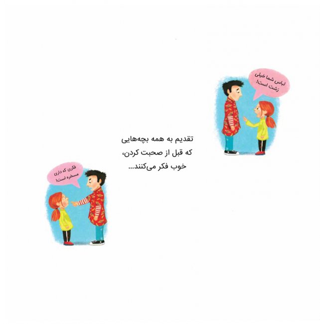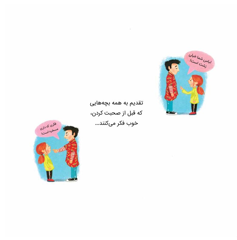 2) قطعا باید بیش از این به موضوع فکرکردن قبل از حرفزدن پرداخته بشود. بعضی از بچهها گاهی آگاهانه بدجنس میشوند و هر حرفی که به ذهنشان میرسد را بازگو میکنند، بدون اینکه لحظهای به احساسات طرف مقابل فکر کنند. نویسنده در این کتاب زیبا و رنگارنگ، تلاش میکند تا کودکان بتوانند خود را جای دیگران بگذارند و درک کنند که آنها وقتی کلماتی بدون فکر و تامل را به زبان میآوریم چه حسی پیدا میکنند
