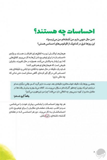 این کتاب، در ادامهی کتابهای «چگونه از بدنم مراقبت و نگهداری کنم؟» به نحوهی مدارا کردن با احساساتت میپردازد. چه شاد باشی، چه غمگین، چه عصبانی یا نگران و هیجانزده، چه بترسی یا سرخوش باشی، با خواندن این کتاب، چیزهایی را یاد میگیری که در پذیرش و مدیریت احساساتت به کمکت میآیند.