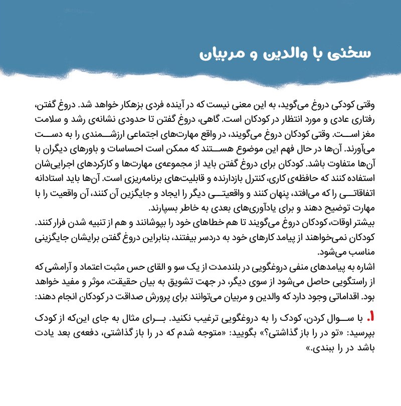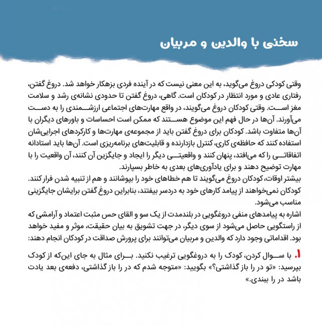 4) من این کتاب را به والدین کودکان دبستانی پیشنهاد میکنم. مراجعان کوچک من که با دروغگویی مشکل آفریده بودند، توانستند با این کتاب ارتباط برقرار کنند.