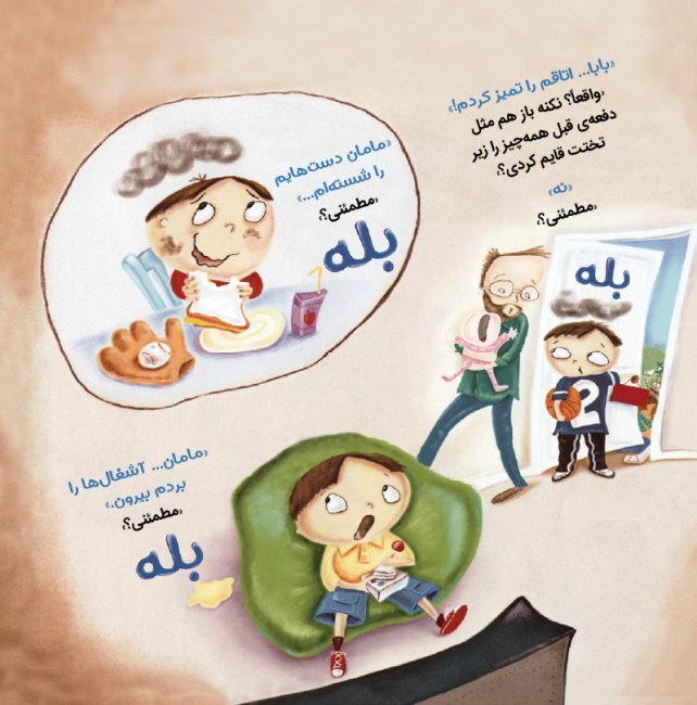 3) من از اینکه کودک هفت سالهام از این کتاب خوشش آمده بسیار خوشحال شدم و مطمئنم که تصاویر و محتوای کتاب تا مدتها در ذهنش میماند و باعث میشود که به آنها عمل کند. ما وقتی که او داستانگویی را شروع میکند، از جملهی «طوفان به پا نکن» استفاده میکنیم و او داستانسراییاش را تمام میکند و حقیقت را میگوید.