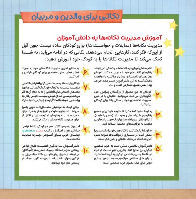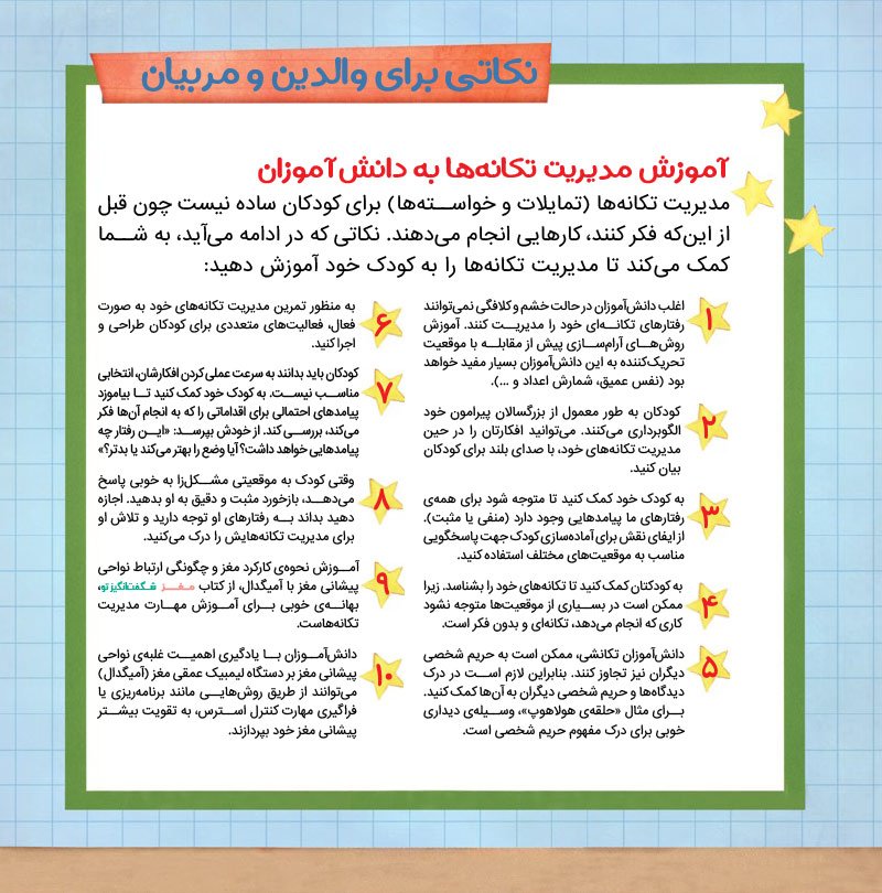 مارجوری اج، مشاور مدرسه (Marjorie Edge): آموزشِ کنترل رفتارهای تکانهای به کودکان کاری سخت است. بلاخره، کتابی چاپ شد که این موضوع را با طنز به کودکان یاد میدهد.