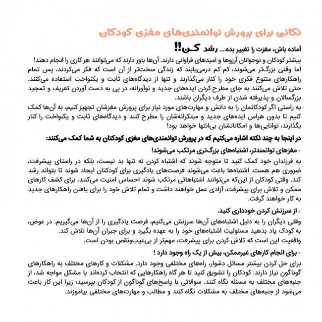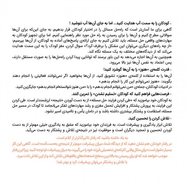 2) اگر فرزند شما به خاطر عالی و بینقص نبودن در چیزی اصلا آن را امتحان نمیکند. پس این کتاب را حتما برایش تهیه کنید. کودکان درس بزرگی از این کتاب میگیرند: قدرت کلمه «هنوز» را یاد میگیرند و آن را به جای «هرگز» به کار میبرند.