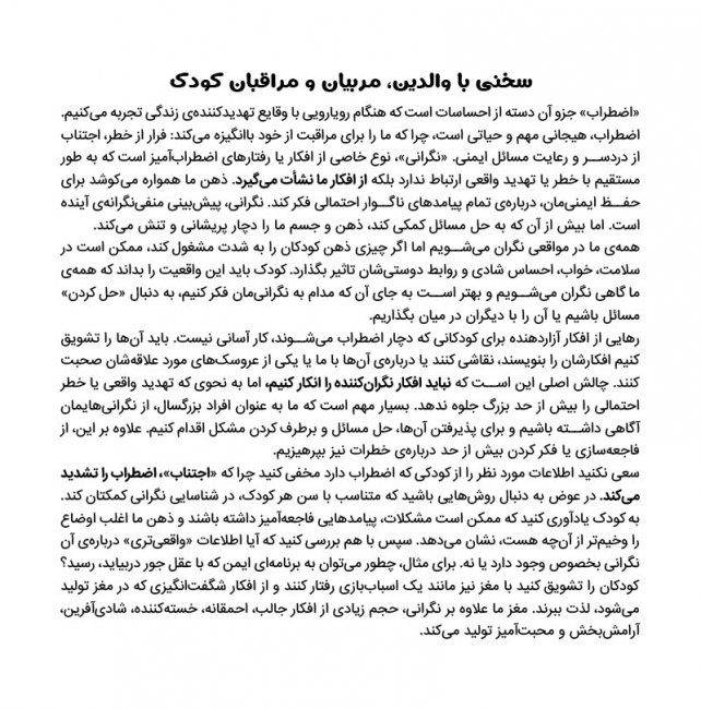 2) این کتاب بهدرستی مفهوم نگرانی واضطراب را در ذهن کودک میسازد که در رشد عاطفی کودک بسیار مفید است. من بهشخصه از خواندن کتاب لذت بردم.