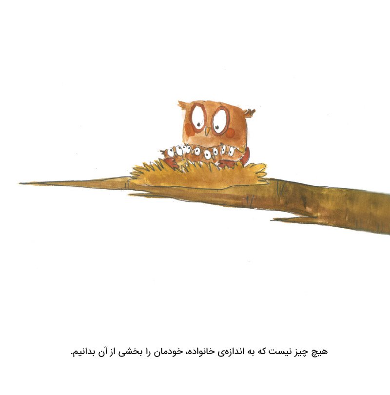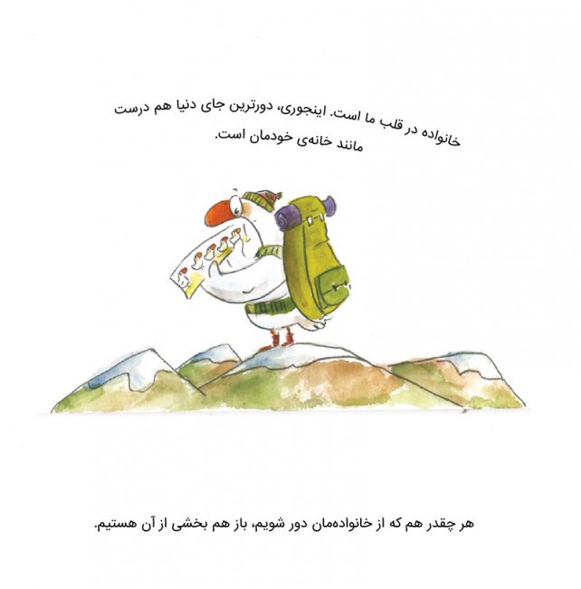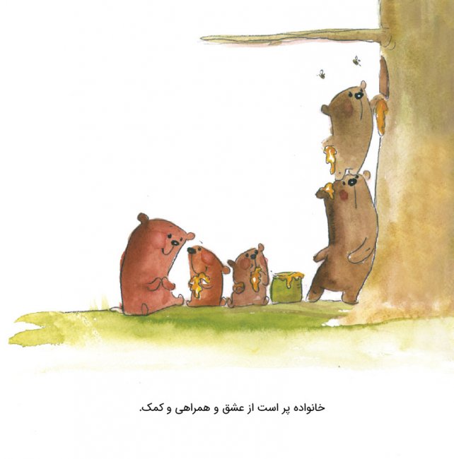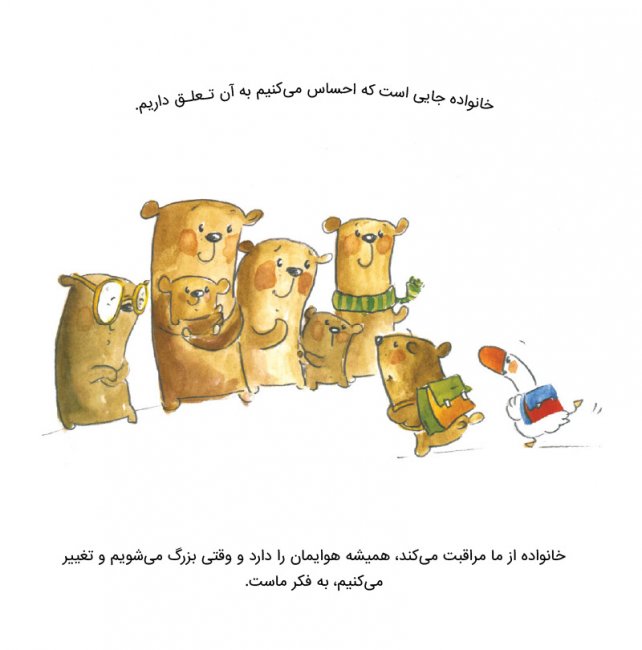 1) كتابي راجع به كودكان و احساس تعلق به خانواده. خانواده در روزهاي سخت كنارمان ميماند و كمكمان ميكند تا از اشتباهاتمان چيزهاي جديد ياد بگيريم. وقتي رو به راه نيستيم، خانواده هميشه هوايمان را دارد. خانواده در قشنگ ترين لحظات هم كنارمان است؛ وقتهايي كه كنار خانوادهمان هستيم، شبيه هيچ وقت ديگري نيست