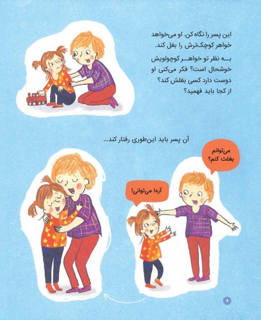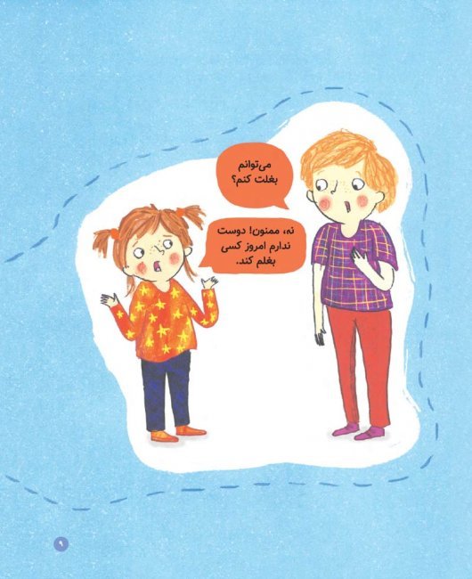 2) این کتاب را حتما بخرید، خیلی کتاب خوبی است. من این کتاب را برای دو فرزندم که دو ساله و پنج ساله هستند خواندم؛ بهخصوص برای فرزند بزرگترم خیلی مفید بود چون او همیشه میخواست که دیگران به حریمش احترام بگذارند. کودکان میتوانند در تعاملات و زندگی روزمره خود از اجازهگرفتن و احترام که در این کتاب میآموزند استفاده کنند.