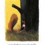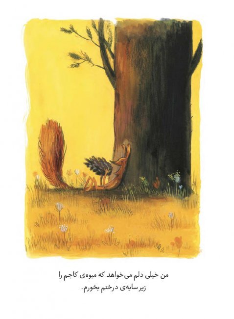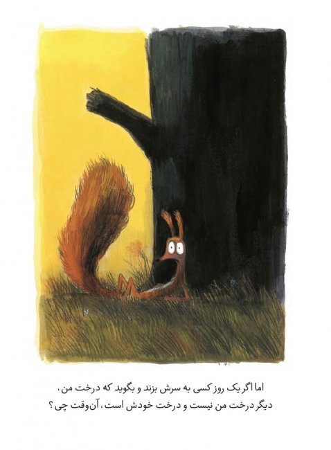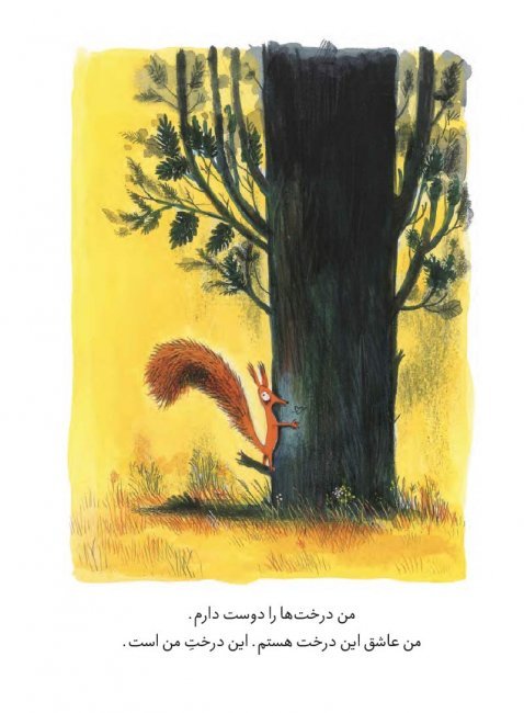 1) ابتدا داستان با این تصویر زیبا شروع میشود: سنجابی که درختی را در آغوش گرفته است و میگوید من درختان را دوست دارم، من این درخت را دوست دارم؛ این درخت مال من است.