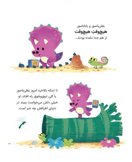 بغلیناسور که هیچوقتِ هیچوقت از باباناسورش جدا نشده بود، یک روز زیر امواجِ طلایی خورشید با کلی ذوقوشوق راه افتاد، آخه دلش میخواست ببیند در دنیای...