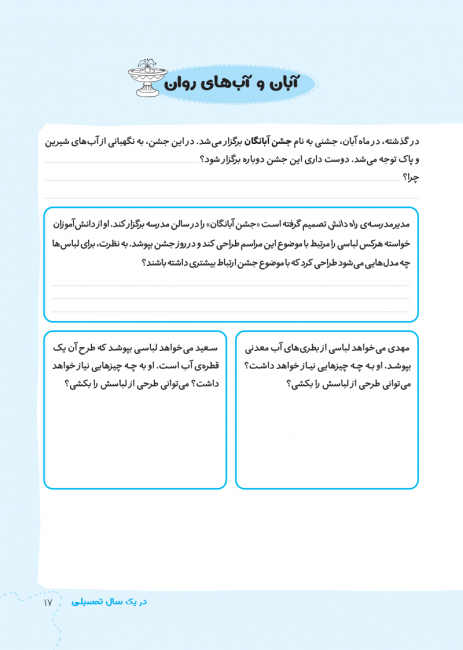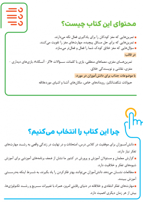 تمرینهای مجموعهی «باشگاه تفکروخلاقیت»، ذهن کودکان را برای یادگیری، فعال نگه میدارد تا مهارتهای ی خود را پرورش دهند. این مجموعهی بومیسازیشده، سعی دارد بستری مناسب برای تقویت کارکردهای پیچیدهی دانشآموزان دورهی دبستان ایجاد کند تا با موضوعات متنوع مواجه شوند و قوهی تخیل و منطق خود را به کار گیرند.