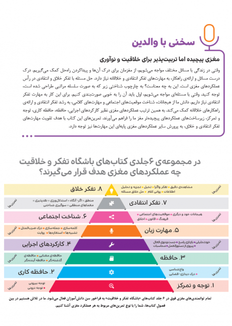 تمام توانمندیهای ی برای پرورش تفکر خلاق و انتقادی متناسب با رشد سنی و آموزشی دانشآموزان در هر جلد تمرین میشود. همچنین همراهان این باشگاه به تدریج با انواع تمرینهای تقویت هر عملکرد ی آشنا میشوند.