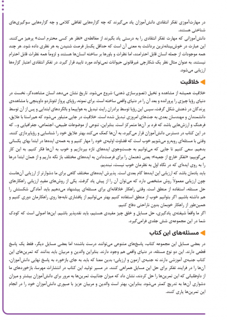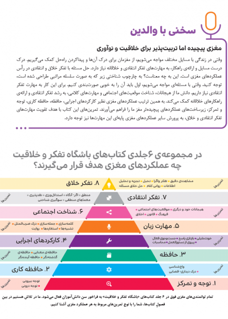 تمام توامندیهای ی برای پرورش تفکر و خلاق و انتقادی متناسب با رشد سنی و آموزشی دانش آموزان در هر جلد تمرین میشود. همچنین همراهان این باشگاه به تدریج با انواع تمرینهای تقویت هر عملکرد ی آشنا میشوند.