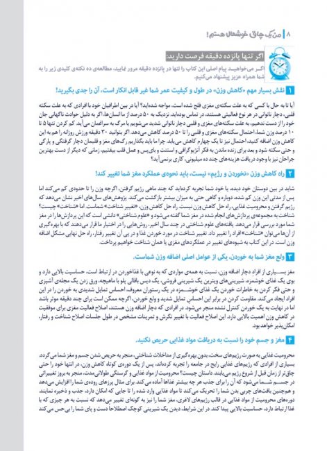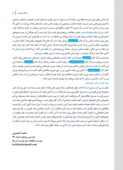 «چاق خوشحال» معرفی راهکارهای اصلاح رفتار و تقویت توان مغز برای مهار همهی خوردنهایی است که برای ما مریضی و سنگینی و کاهش عمر به همراه میآورند. در این کتاب باور خواهیم کرد تا نپذیریم که «چاق هستیم» و تا «خوشحالی» را با این پذیرش همراه نکنیم مسیر بهبودی ما آغاز نمیشود. مسیر مرحله به مرحلهی این کتاب در 24 پله، آموزشهای لازم را براساس دانش روز دنیا و تجربهی بومی ما در اختیار شما قرار میدهد. «چاق خوشحال» کتاب همهی آنهایی است که از رژیمها و محدودیتهای غذایی برای کاهش وزن خسته شدهاند. «چاق خوشحال» پیام ما به همهی دوستانی است که به علت ترس از شکست، از رژیمهای غذایی برای لاغر شدن فرار میکنند. «چاق خوشحال» شاید بتواند امیدی جدید برای عزیزانی باشد که حتی برای لاغر شدن به فکر جراحیهای بسیار خطرناک افتادهاند. «چاق خوشحال» را به تمام فارسی زبانهایی تقدیم میکنم که با کاهش وزن خواهند توانست آیندهای روشنتر برای خود و برای این مرز و بوم اهورایی بسازند.