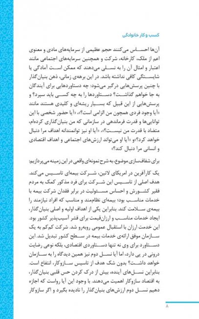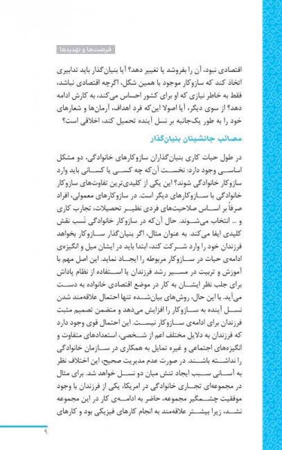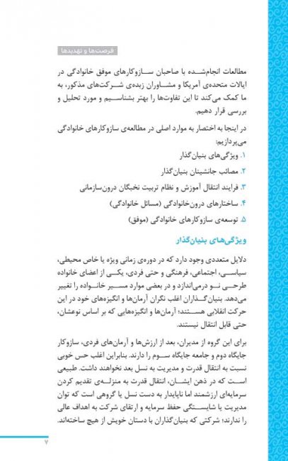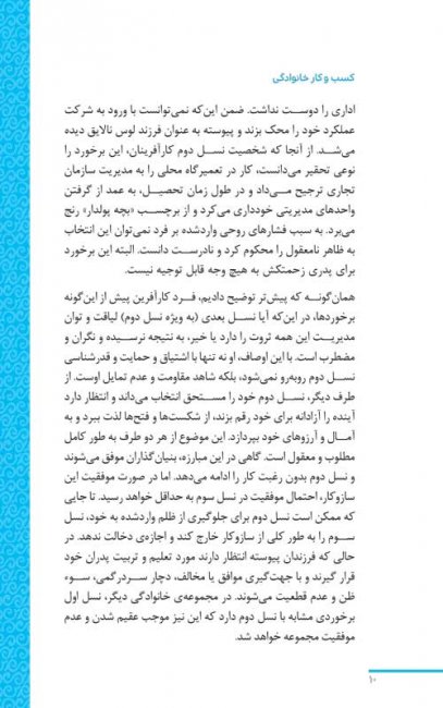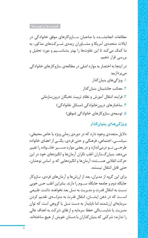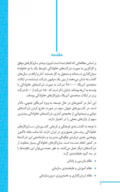 نوع عملکرد این بنگاهها با سایر شرکتها بسیار متفاوت است و ویژگیهای خاص خود را دارد. در کتاب حاضر، با نگاهی اجمالی به تاریخچهی این بنگاهها، مواردی از قبیل ویژگیهای بنیانگذار ، مصائب و مشکلات جانشینان وی، فرایند انتقال آموزش و نظام تربیت درونسازمانی، ساختارهای درونخانوادگی، توسعهی این بنگاهها، نظام ارزیابی درونسازمانی، سیاستگذاری انتقال قدرت به نسل بعد مدیران و همچنین نظام ارتباطی بین افراد خانواده در انواع مالکیت این بنگاهها اعم از مدیریت مطلق خانوادگی، مالکیت خانوادگی و مدیریت ترکیبی، و مالکیت خانوادگی و شایستهسالاری در مدیریت، مورد بررسی و پژوهش قرار میگیرد.