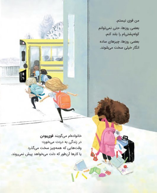 من کتاب «قوی باش» را خیلی دوست داشتم. بسیار جالب است که این کتاب نه تنها راههای قویبودن را به افراد نشان میدهد بلکه راههایی را نشان میدهد که افراد نسبتاً قوی چگونه به دیگران کمک کنند، تغییر ایجاد کنند و جهان را به جای بهتری تبدیل مینمایند. همهی کودکان و بزرگسالان هرازگاهی احساس میکنند که به اندازهی کافی قوی نیستند. این کتاب، یک گفتگوی انگیزشی فوقالعاده را شروع میکند و به شما برای برداشتن گامهای کوچک برای قویبودن و تسلیمنشدن انگیزه میدهد. گاهی ما به کمک احتیاج داریم و خوب است بدانیم که در کنار هم، قویتر هستیم.
