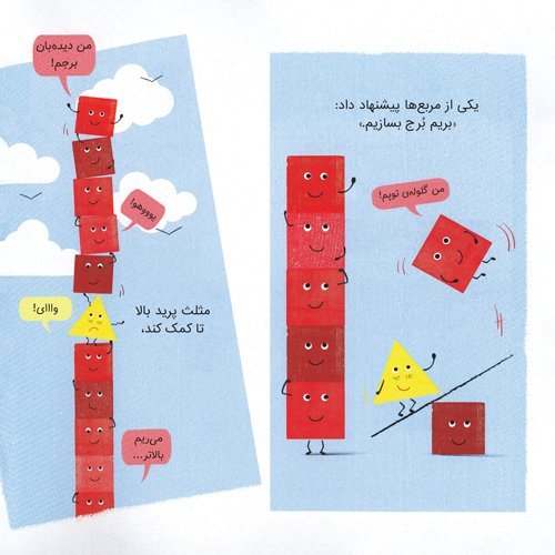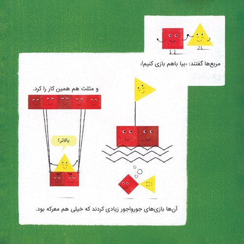 2) من این کتاب را به چندین دلیل دوست دارم. اول اینکه شما با خواندن این کتاب رنگها، اشکال هندسی و الگوها را به کودک یاد میدهید. تصاویر کتاب ساده و تاثیرگذار هستند و گفتوگوی درون حباب شخصیتها بر غنای متن افزوده است. ردهی سنی این کتاب، برای کودکان بالای 4 سال مناسب است اما کودکان بزرگتر هم از خواندن آن لذت میبرند. من یک دختر 4 ساله دارم که از دیدن تصاویر و اشکال لذت میبرد. من با او دربارهی پیام این کتاب- پذیرش خود و تفاوت دیگران- صحبت کردم.