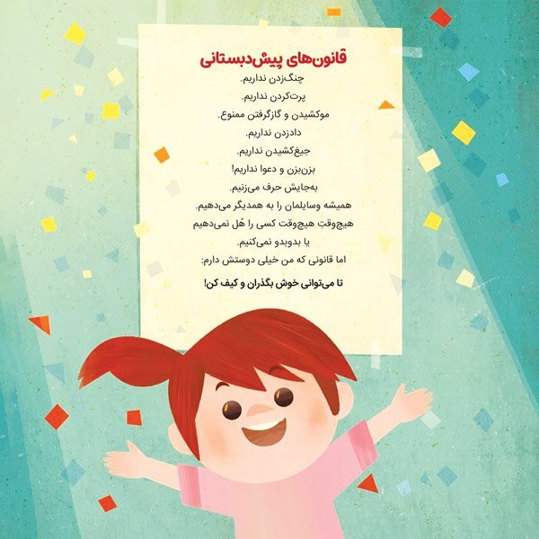 امروز، اولین روز پیش دبستانی من است. آنجا یک عالمه قانون بامزه داریم! تازه، کارهای جالبی هم انجام میدهیم: شنبازی، رنگبازی، قصهخوانی برای خرسیها،...