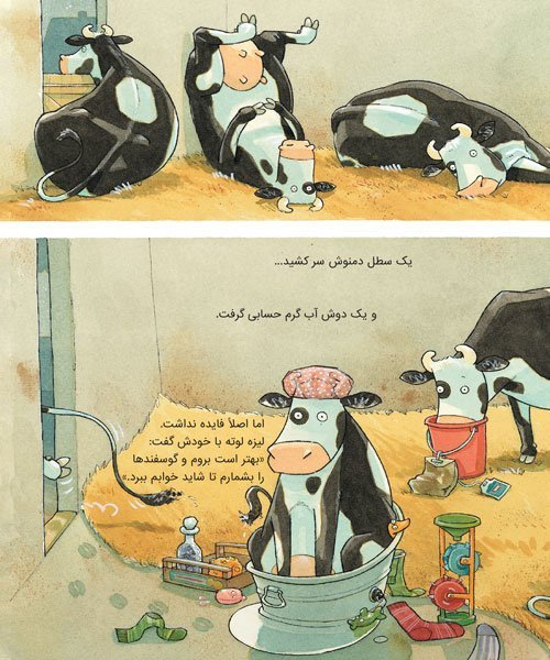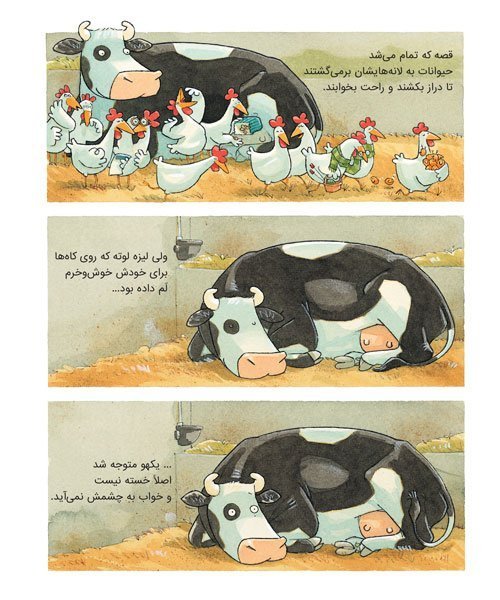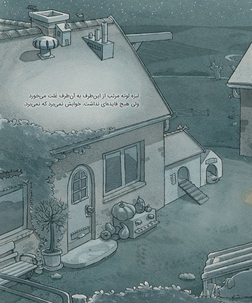 هر روز غروب که میشد، خانم مزرعهدار قبل از خواب برای حیوانات مزرعه قصه تعریف میکرد. بعد هم آنها به لانههایشان برمیگشتند تا راحت بخوابند. یک شب لیزهلوته هرچه روی کاهها غلت زد، خوابش نبرد که نبرد. یکعالمه راه امتحان کرد. لیزهلوته نصفهشبی راه افتاد توی مزرعه و هر کاری کرد شاید خوابش ببرد، حتی سرش را کرد توی مرغدانی!