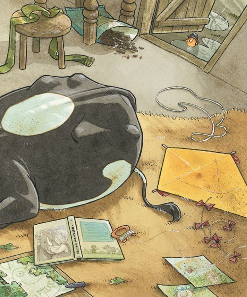 لیزهلوته میخواست بادبادک جدیدش را هوا کند که یکهو شُرشُر باران بارید. او مجبور شد توی خانه بماند. لیزهلوته خیلی حوصلهاش سررفته بود. البته او اینجور وقتها یکعالمه کار بلد بود، انجام بدهد: طناببازی، جورچین و بازی با جوجهها. حتی به سرش زد توی خانه بادبادکبازی کند.