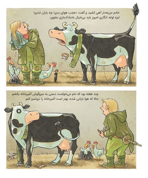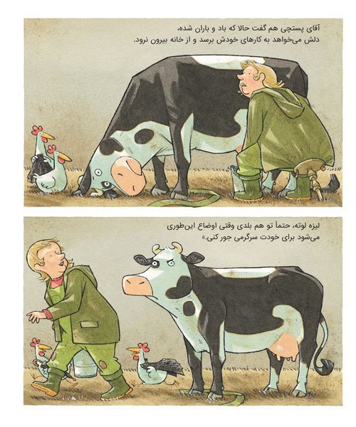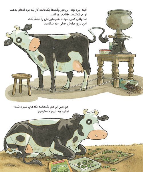 این کتاب با تصاویر بینظیر و جذاب، ماجرای گاو بامزهی مزرعه را به تصویر میکشد که بیحوصله شده و به هر دری میزند تا راههای جالبی را پیدا کند و سرگرم شود. یکعالمه ماجرای جالب پیش میآید و لیزهلوته دست از تلاش برنمیدارد و مدام راه جدیدی را امتحان میکند.