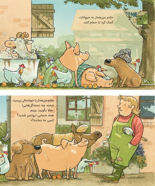لیزهلوته شوالیه شده بود و با مرغها و خروسها بازی میکرد. او حسابی خاکوخُلی و کثیف شده بود. خانم مزرعهدار داد زد: «بازی دیگر بس است! وقت حمام کردن است!» همهی حیوانات مزرعه حمام کردند و تر و تمیز و دستهگل شدند. پس لیزهلوته کو؟ لیزهلوته اصلاً دلش نمیخواست حمام کند. البته خانم مزرعهدار هم اصلاً دلش نمیخواست لیزهلوته کثیف و چرکولک باشد.