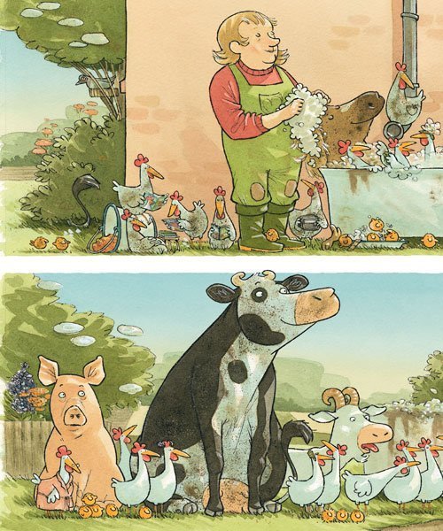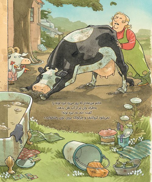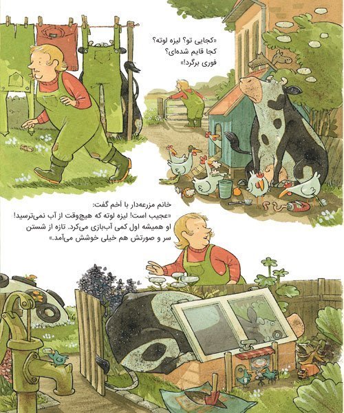 لیزهلوته شوالیه شده بود و با مرغها و خروسها بازی میکرد. او حسابی خاکوخُلی و کثیف شده بود. خانم مزرعهدار داد زد: «بازی دیگر بس است! وقت حمام...